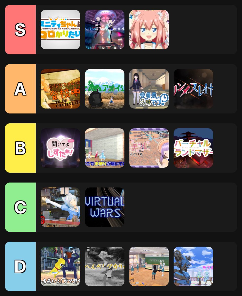 https://pbs.twimg.com/media/G5M3IT9aEAAuoU9.jpg当時ぶりに「 バーチャルさんはみている 」12話分を真面目にみて、面白いコーナーTier表を作りました。