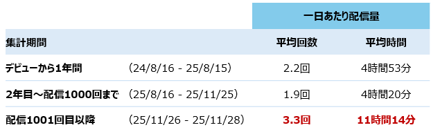 218 名無しさん 2025/11/30(日) 18:08:02.92 ID:CR5wP4ea- 基本的に配信時間ではなく回数の話をしないと12時間配信を毎日やってる連中が比較対象になってしまうという構造的欠陥を感じる