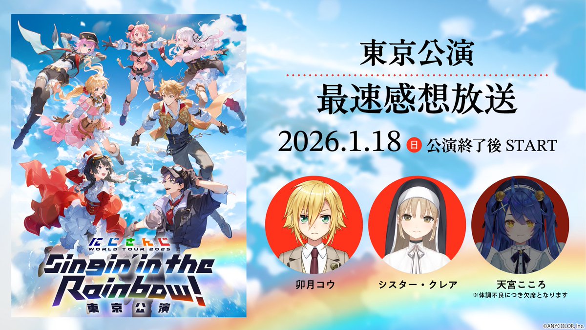 【東京公演】にじさんじ WORLD TOUR 2025 Singin’ in the Rainbow!最速感想放送 ※冒頭は無料で視聴可能 [2026/01/18 20:00:00] - 株式会社ドワンゴ