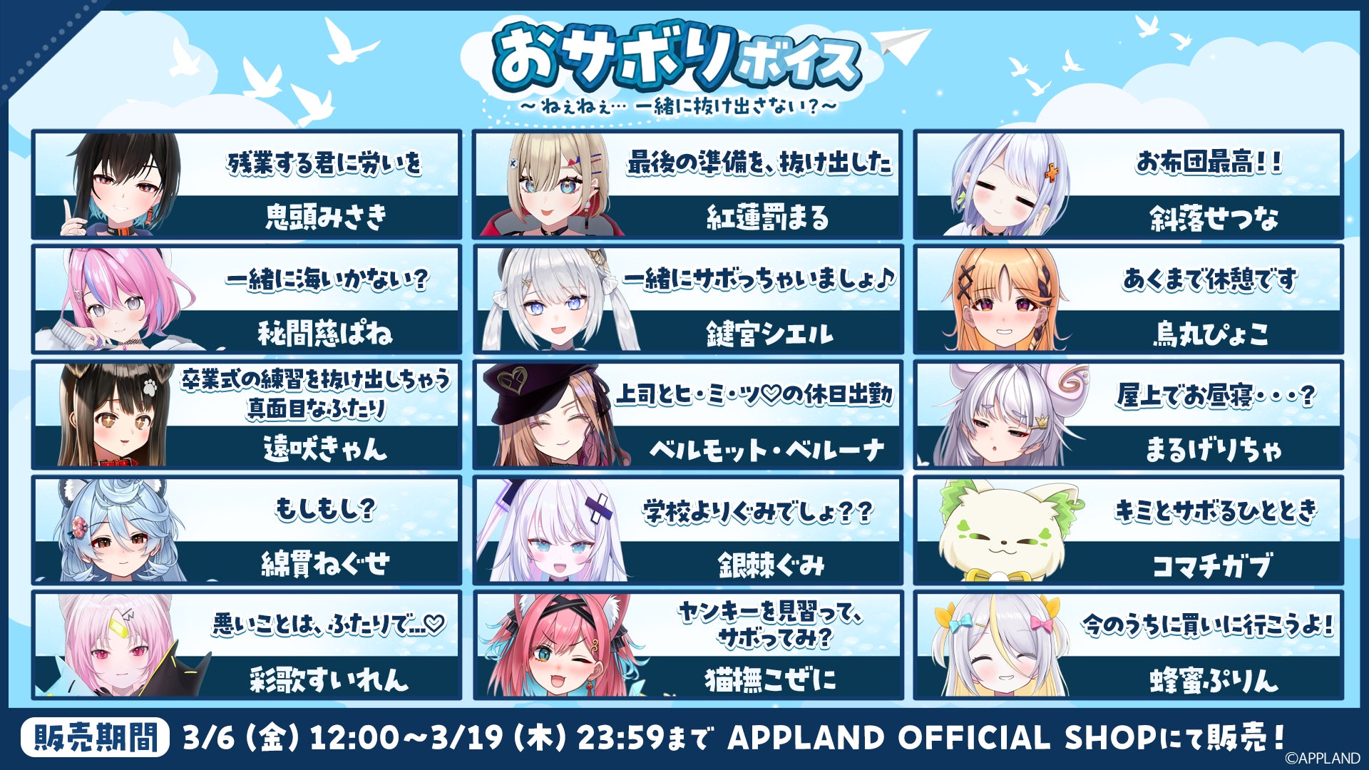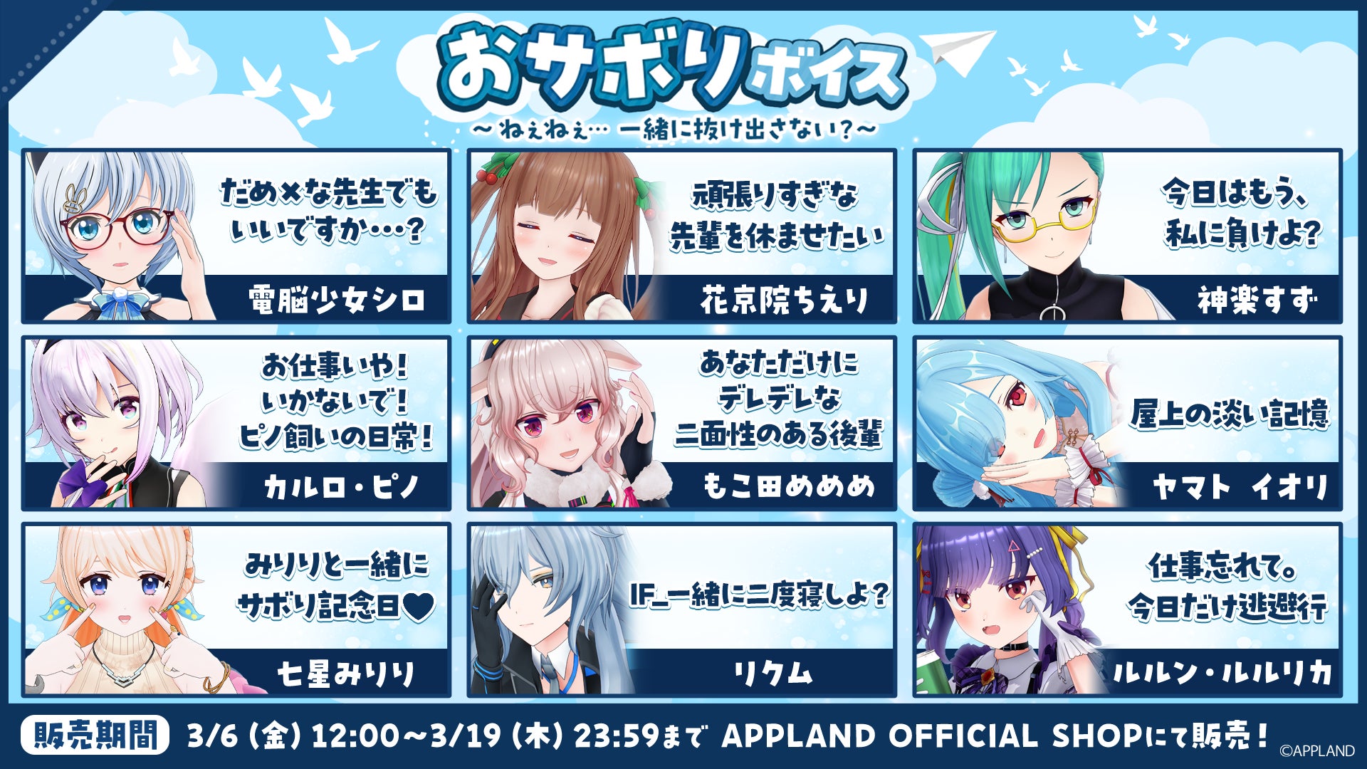 - 「.LIVE」・「ぶいぱい」の『おサボりボイス~ねぇねぇ... 一緒に抜け出さない?~』が3月6日(金)より販売開始! | 株式会社アップランド (2026/03/05 12:30:01)